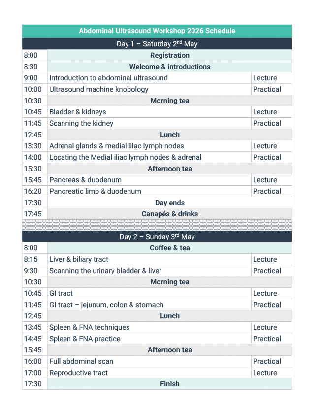 No experience is necessary. Absolute beginners are welcome, and if you’re already scanning, you’ll be taking your imaging skills to the next level. Don’t miss this opportunity to embrace abdominal ultrasound as an important diagnostic tool at your fingertips. You’ll love meeting our kind and experienced teaching staff, and you’ll enjoy the relaxed and capable atmosphere of our workshops.
